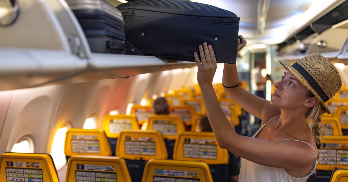 A smiling female passenger is getting on the plane and putting her personal luggage in the overhead luggage compartment of the plane