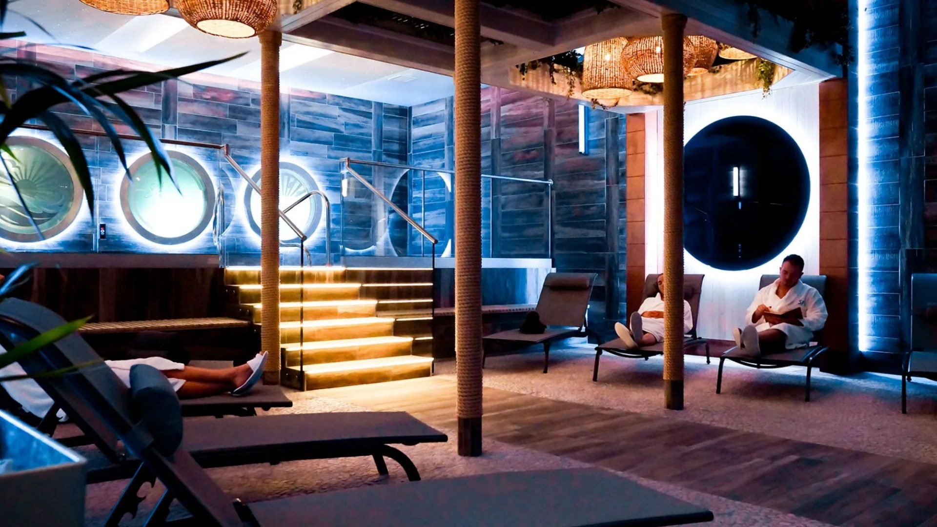Relaxing spa with people lounging in chairs.
