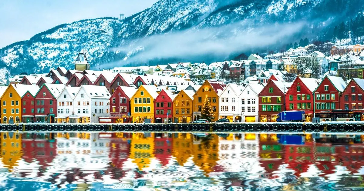 Colourful seafront houses in Bergen, Norway, surrounded by snowy mountains and icy water.