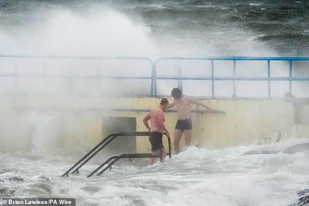 Meanwhile shocking images have revealed two men in Galway, Ireland risking their lives to frolic in the dangerous conditions by going for a swim in the sea at Blackrock Diving Tower.