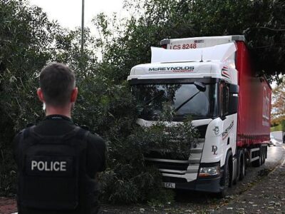 A man is seen walking his dog as police officers attend the scene where a tree struck a passing lorry due to high winds in Antrim, Northern Ireland