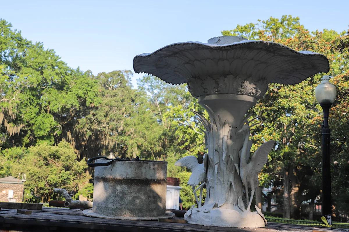 The top bowl of the Forsyth Park fountain sits on a flatbed ready for transport on Tuesday, June 24, 2025.