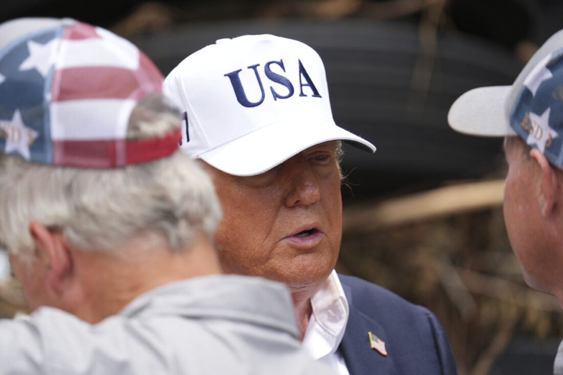 President Donald Trump, center, greets first responders as he observes flood damage in Kerrville, Texas, Friday, July 11, 2025. (AP Photo/Jacquelyn Martin)