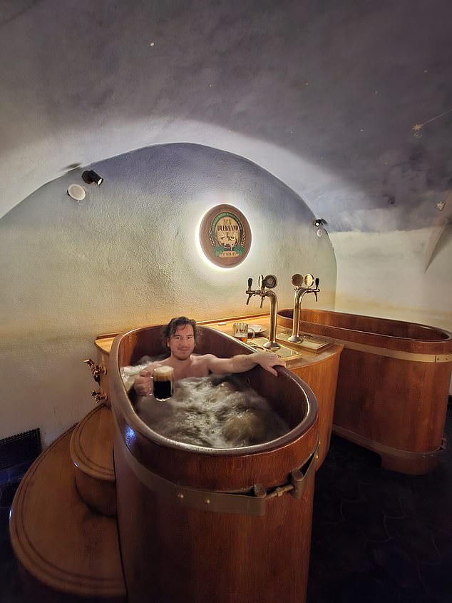 The Mail’s Harry Dougherty settles into a boozy bath on his visit to the world’s first beer spa, in Prague, Czechia