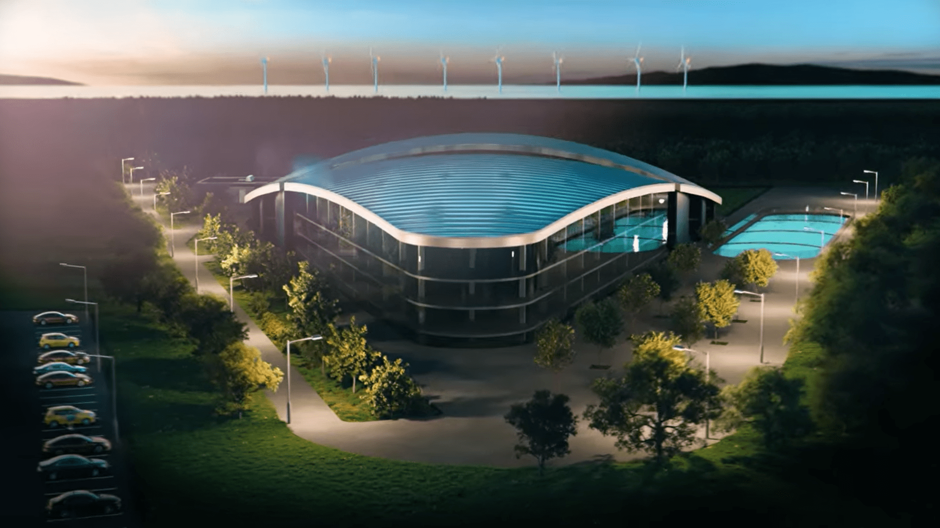 Illustration of a large modern building with a curved roof, an outdoor pool, and a parking lot with several cars, with wind turbines in the background.